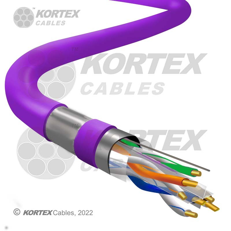 The cable consists of 4 x twisted pair insulated Solid Copper conductors with (FTP) aluminium Foil Screening and LSZH outer sheath in purple This cable also carries a central 'Spline' separating the twisted pairs and preventing Cross Talk.