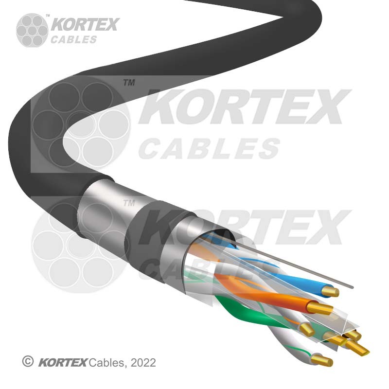 The cable consists of 4 x twisted pair insulated Solid Copper conductors with (FTP) aluminium Foil Screening and weather resistant 'Duct Grade' PE outer Jacket in Black. This cable also carries a central 'Spline' core separator to prevent Cross Talk.