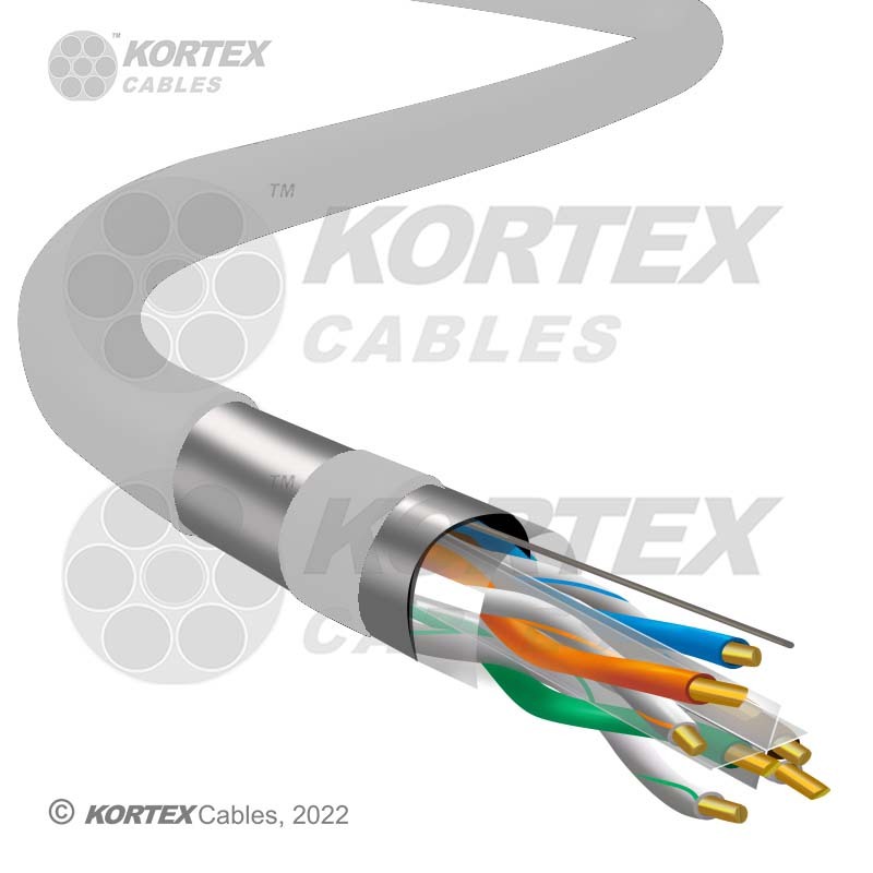 The cable consists of 4 x twisted pair insulated Solid Copper conductors with (FTP) aluminium Foil Screening and PVC outer sheath in grey. This cable also carries a central 'Spline' separating the twisted pairs and preventing Cross Talk.