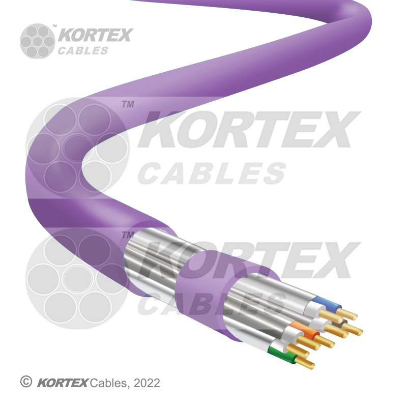 The cable consists of 4 x pairs of Solid 23AWG Copper conductors with Polyethylene insulation and Aluminium foil screening for each twisted pair. LSZH specification outer jacket in purple.
